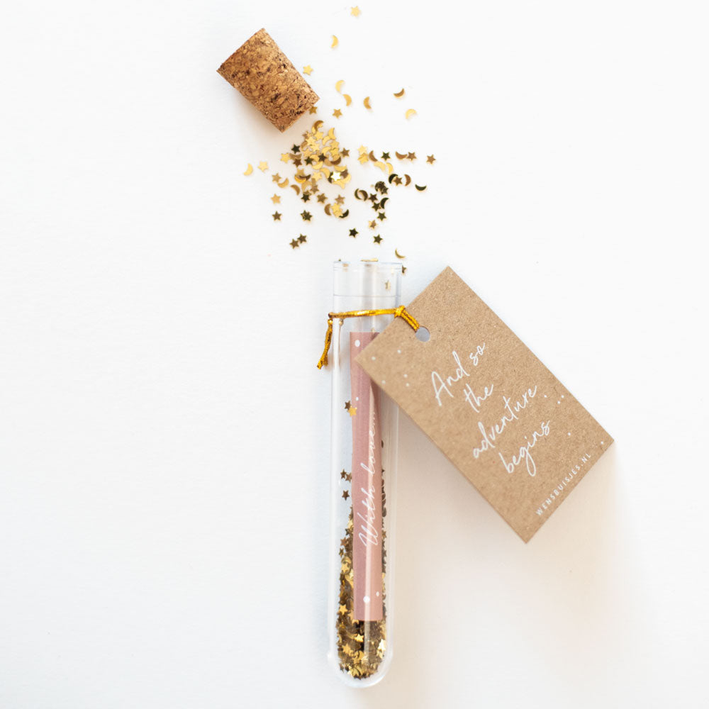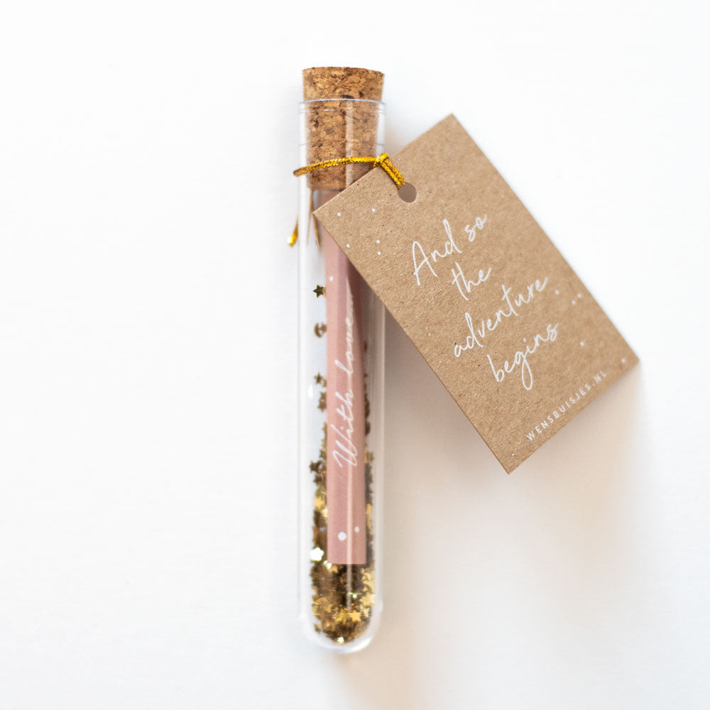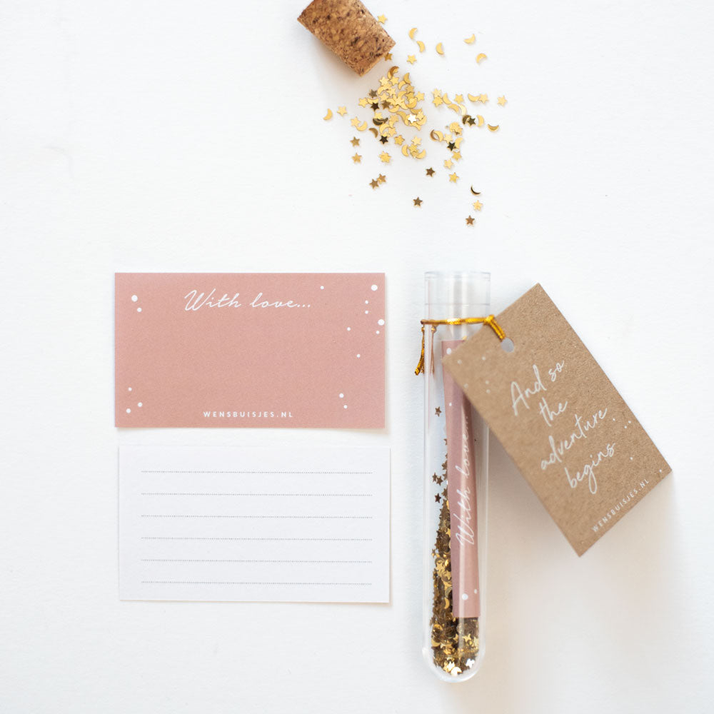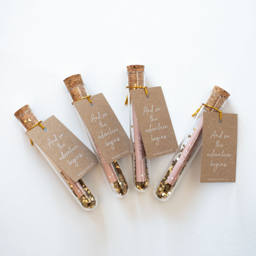 Personaliseer de bedankjes; lever de tekst en eventuele foto aan die jullie graag in het buisje willen zetten en deze worden op het wenskaartje geprint.