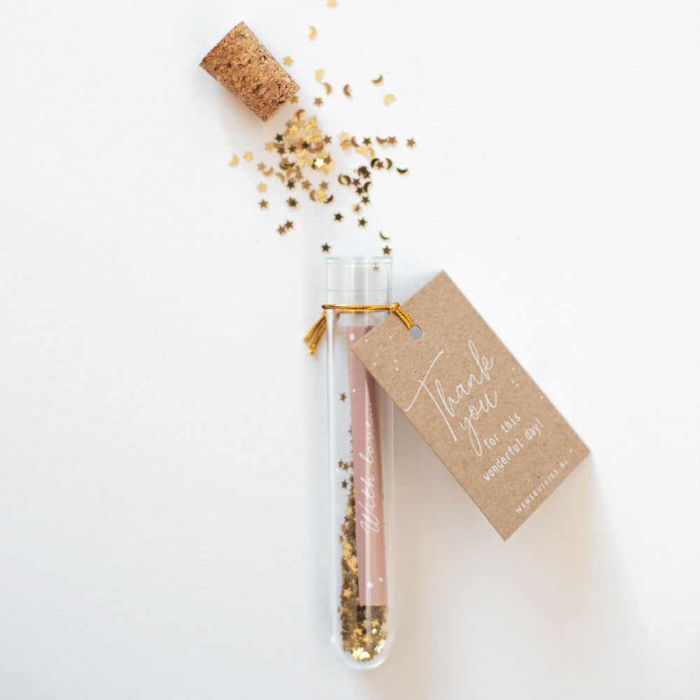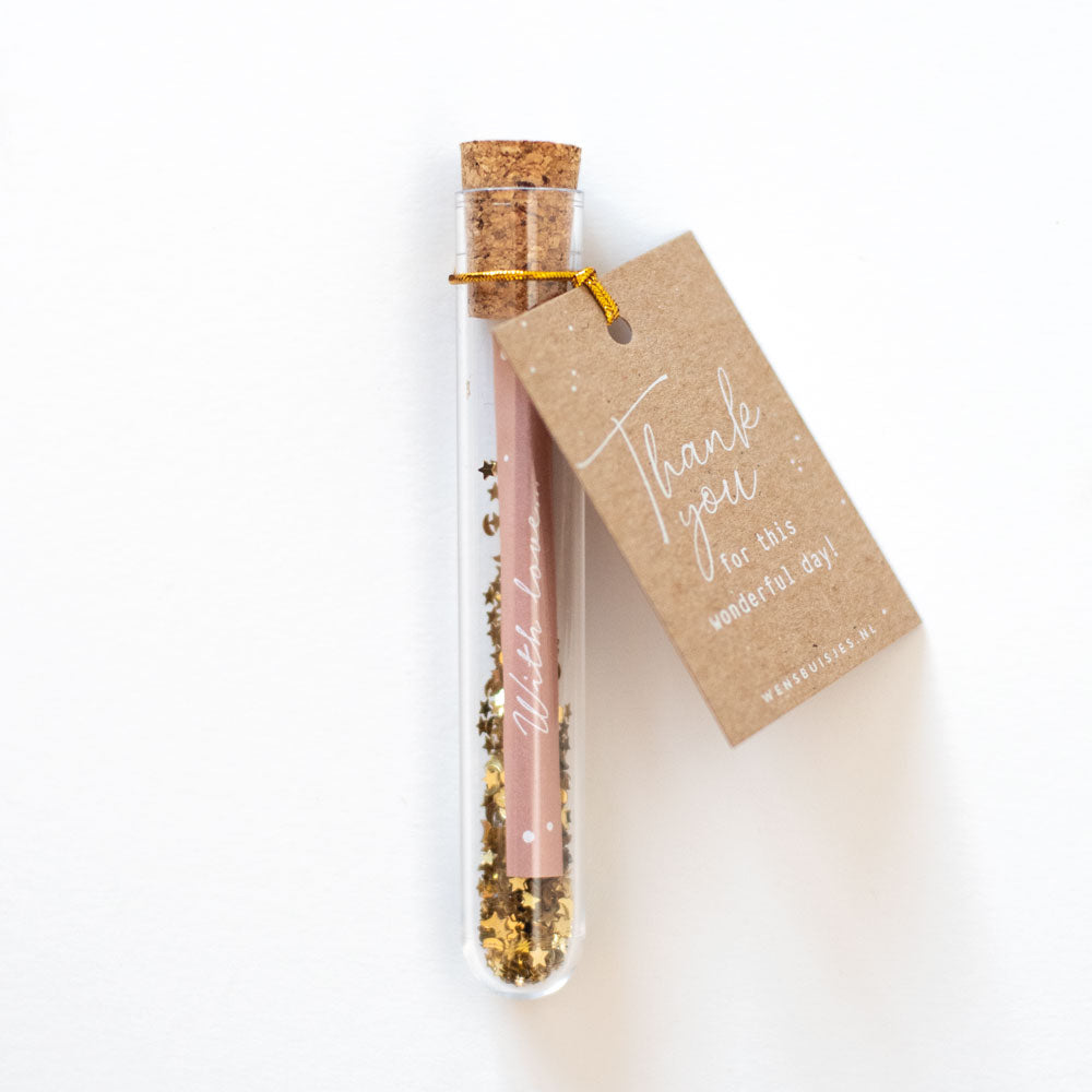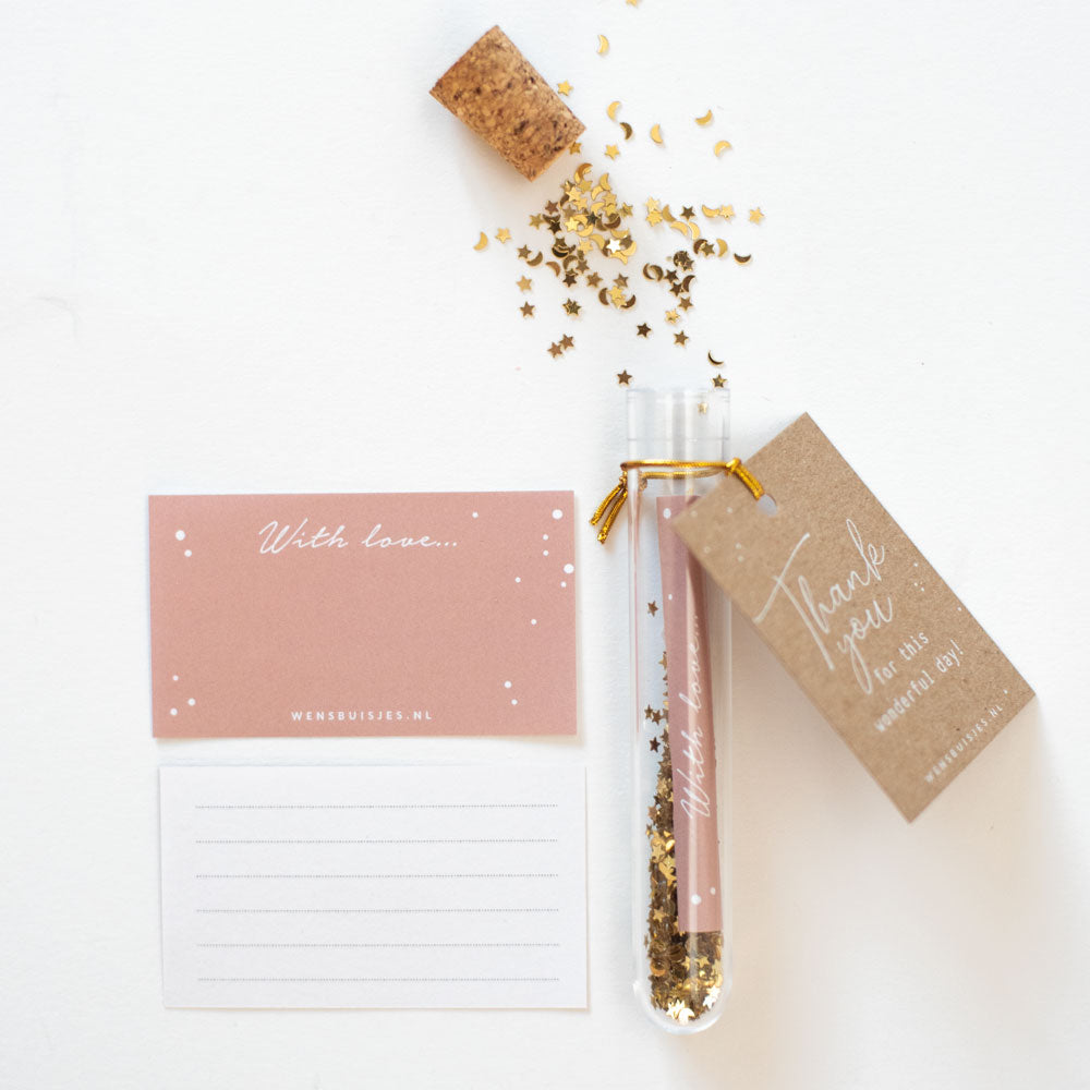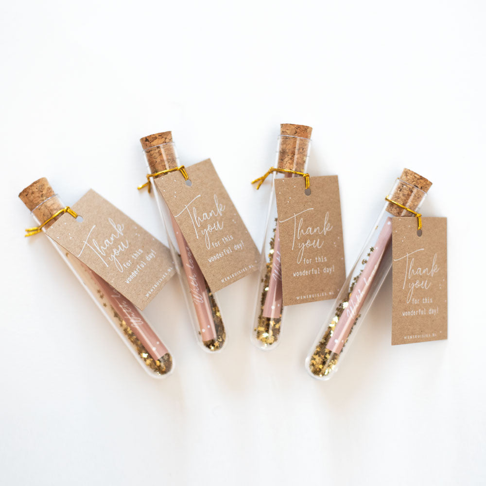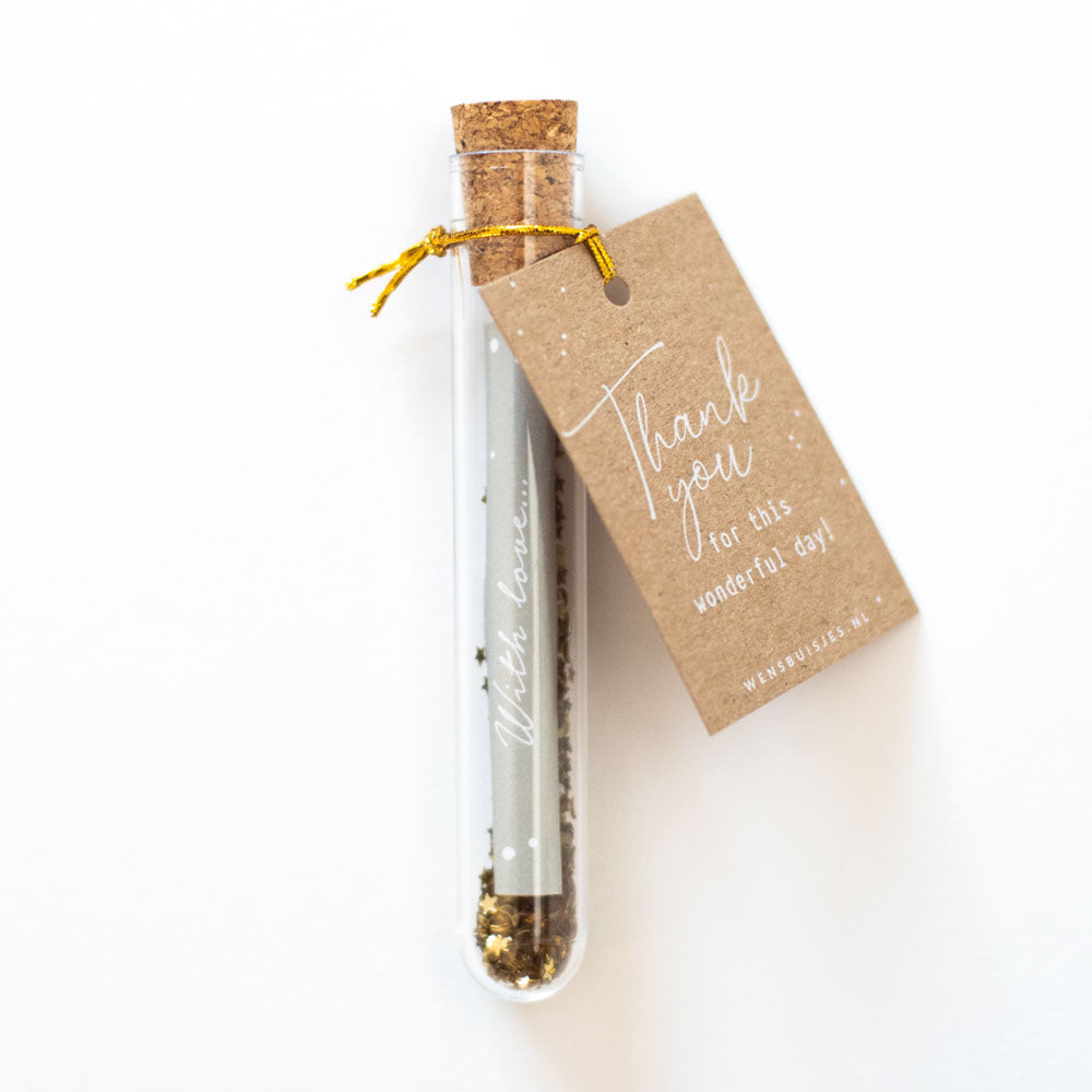 Personaliseer de bedankjes; lever de tekst en eventuele foto aan die jullie graag in het buisje willen zetten en deze worden op het wenskaartje geprint.