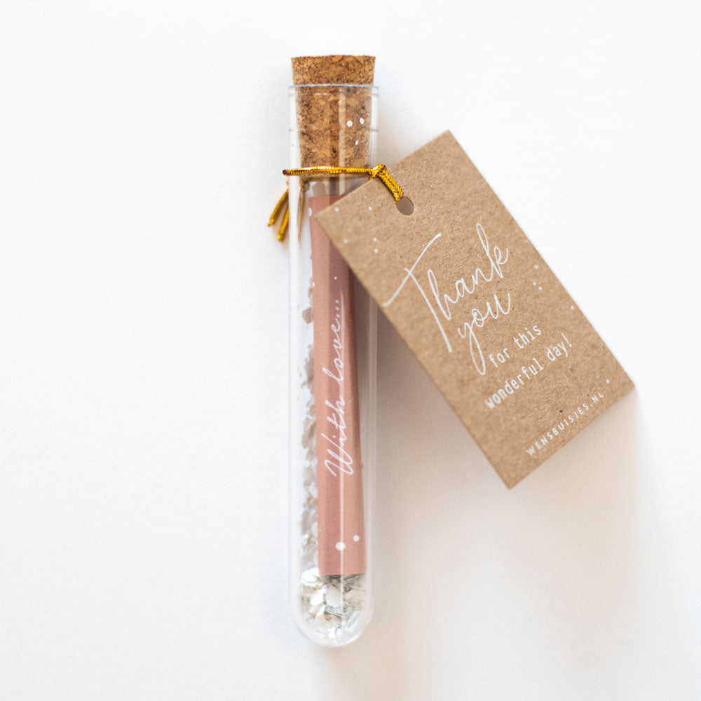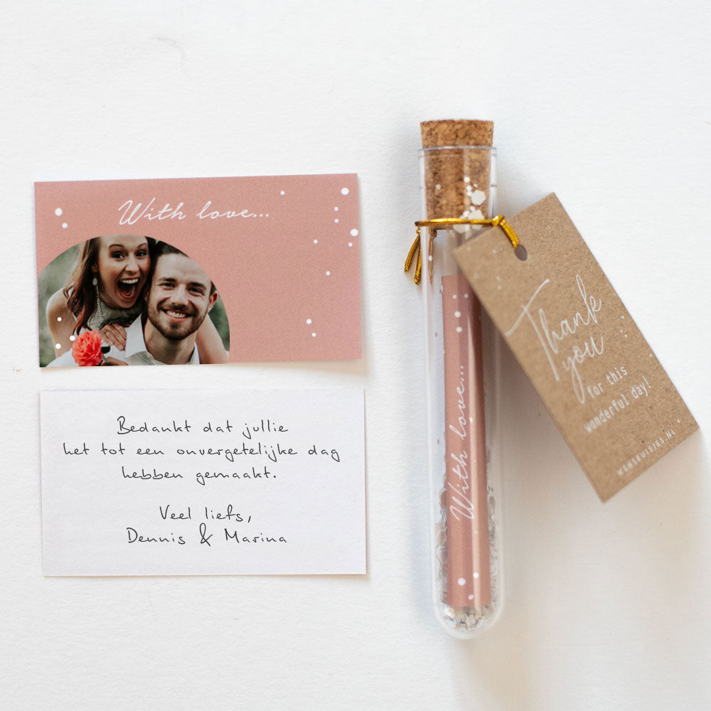 Personaliseer de bedankjes; lever de tekst en eventuele foto aan die jullie graag in het buisje willen zetten en deze worden op het wenskaartje geprint. (leukigheidjes@gmail.com)