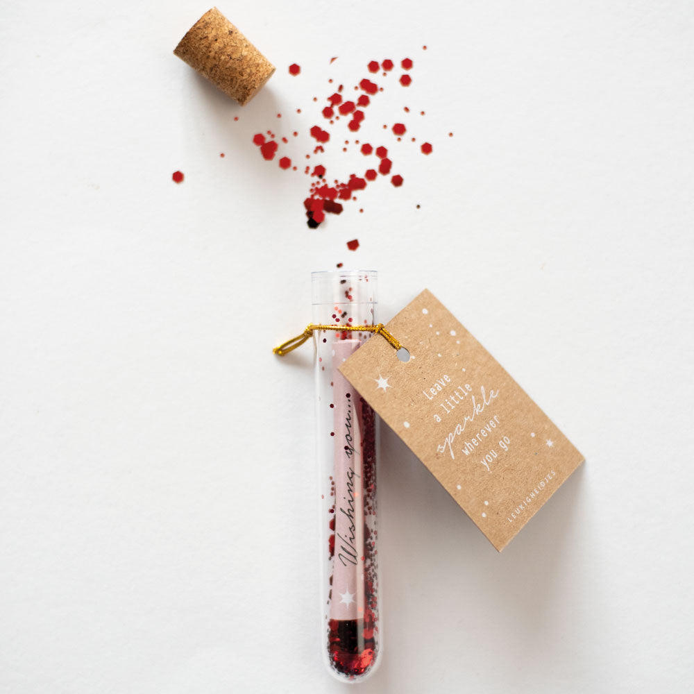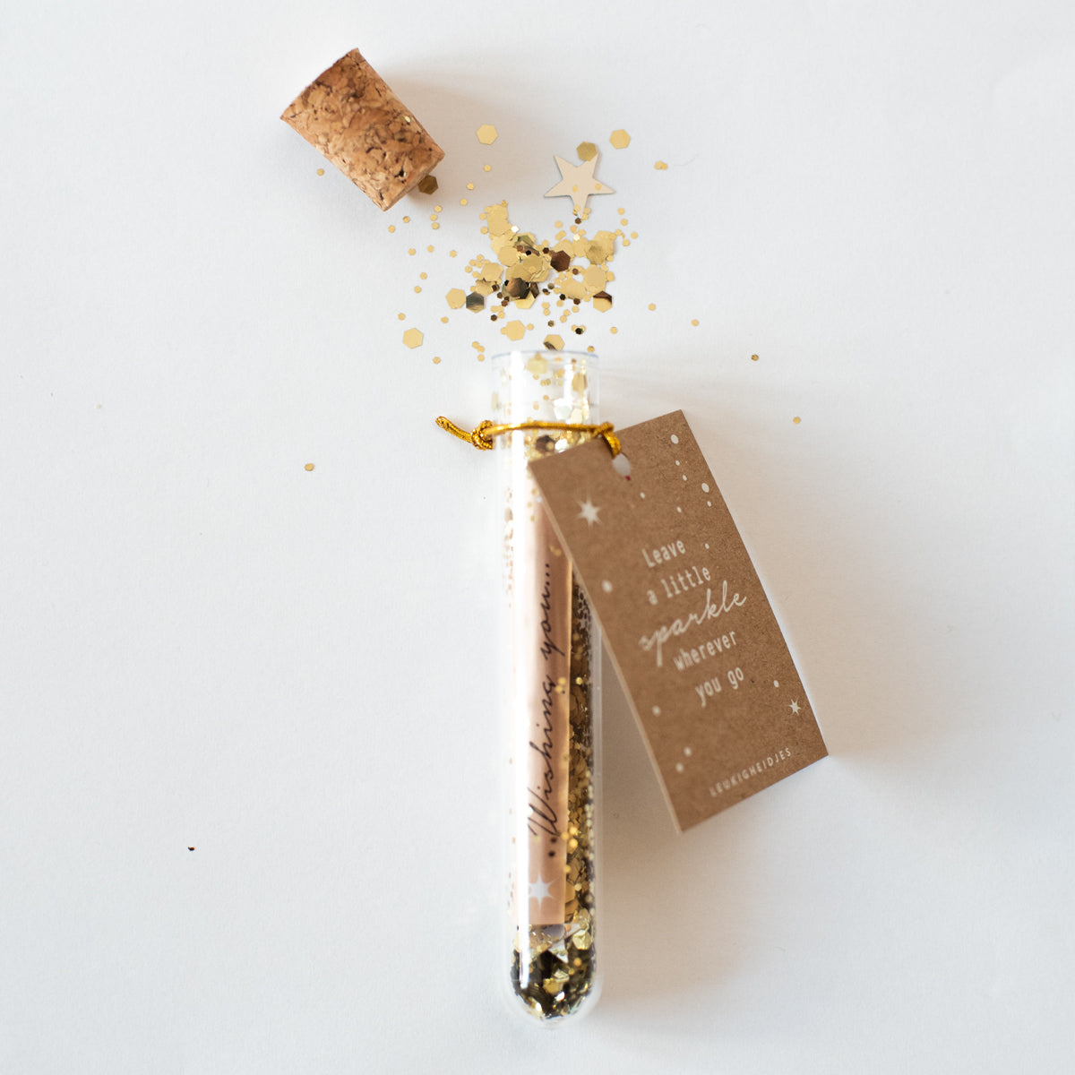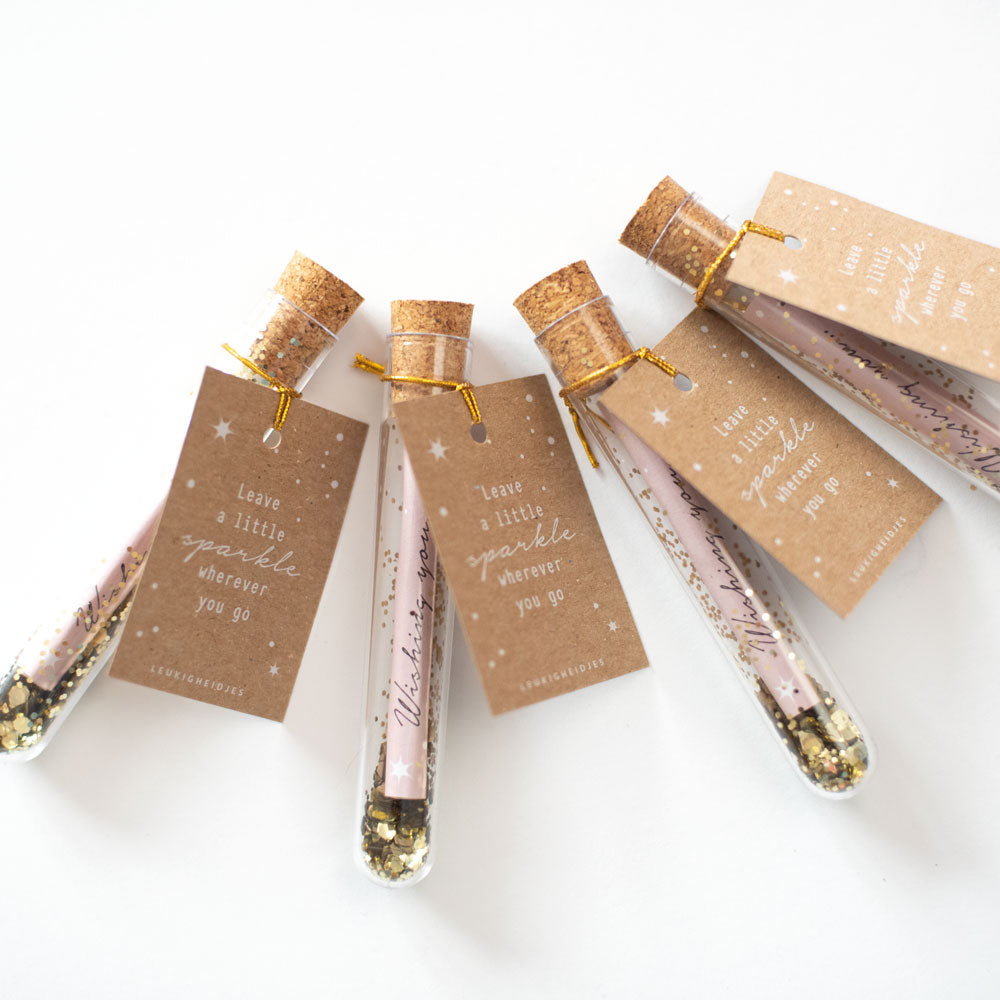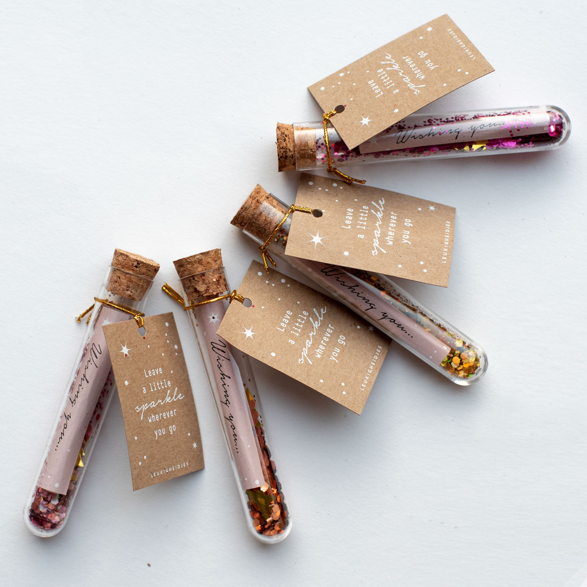 Stuur naar je dierbaren dit mooie originele wensbuisje vol SPARKLES! Weer wat anders dan een standaard kaart. En zeg nou zelf; iedereen kan nu in deze periode van het jaar wel even een Leukigheidje door de brievenbus ontvangen toch?