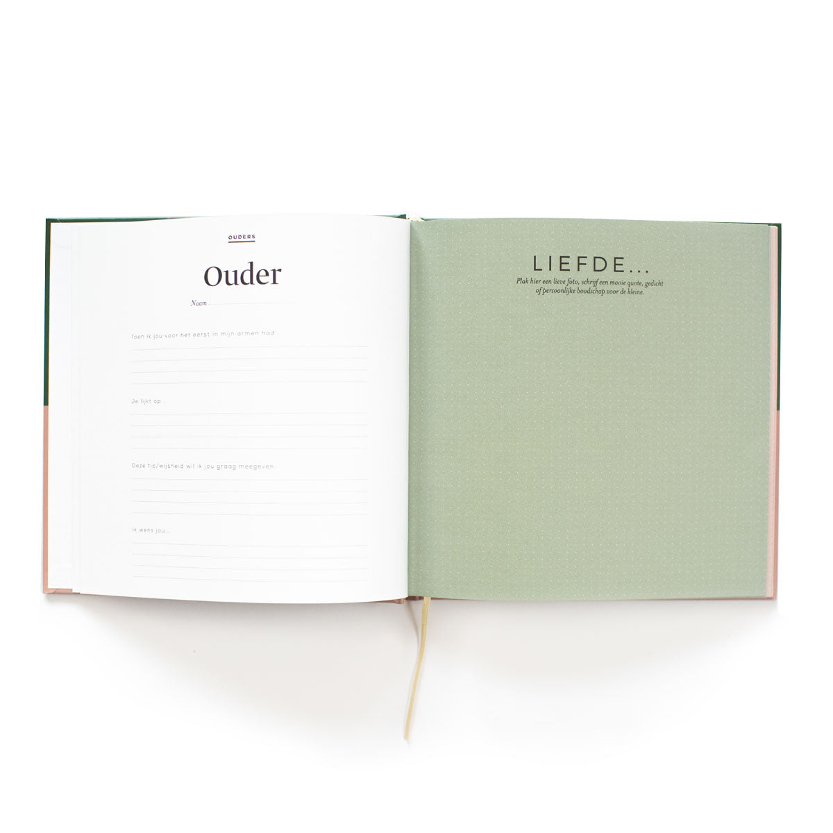 In het boek is er een pagina speciaal voor de kersverse ouders om te schrijven over de eerste kennismaking en momenten samen.